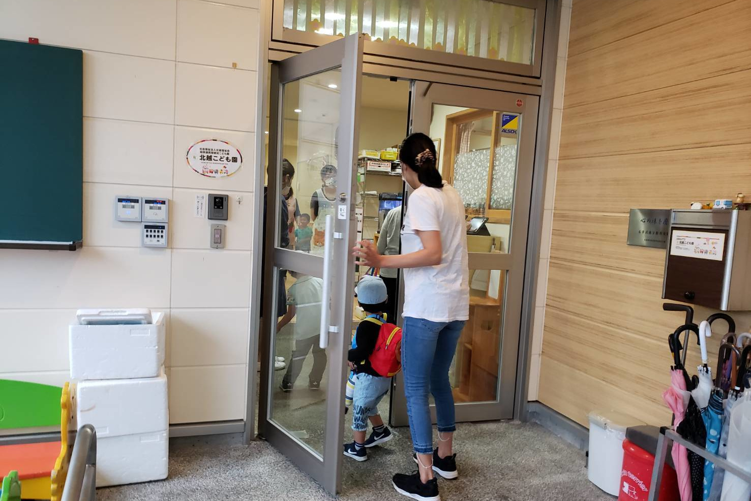 玄関で待っていてくれる園長先生に、元気な声で朝のあいさつをします。 お部屋へ入って所持品を片づけたら、朝の会まで自由あそび。 未満児クラスはおやつも食べます。